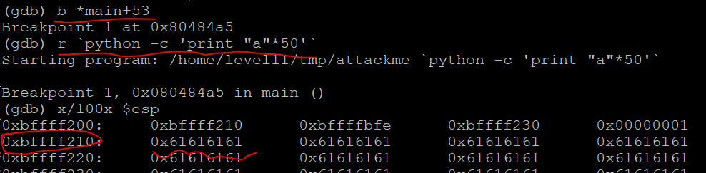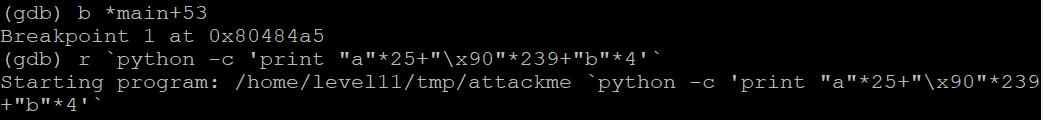 /home/level11/tmp 에 실제 파일 attackme를 복사해서 gdb로 실험합시다.