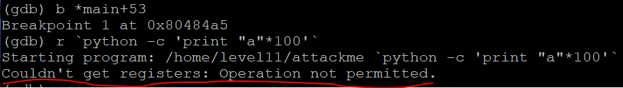 "a"를 100번 넣어서 주소를 확인하려 했는데 "Couldn't get registers: Operation not permitted." 오류가 뜹니다.