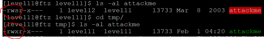 실제 attackme에는 setuid가 있지만 복사본인 attackme에는 setuid가 없기에