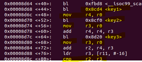 위에 key1, key2, key3의 함수 들어갔다가 나와서 모두 r0의 값을 r3, r4에 넣어서 add하는 등의 전처리를 진행함