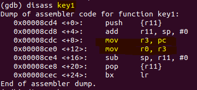 key1()에서 r0는 r3에서 왔고, r3는 pc에서 옴.